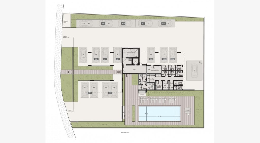 Indulge in leisurely moments at our inviting common swimming pool, while our dedicated parking area and electric vehicle charging point cater to your everyday needs. Embrace sustainability with our photovoltaic electricity producing system, contributing to a greener environment.