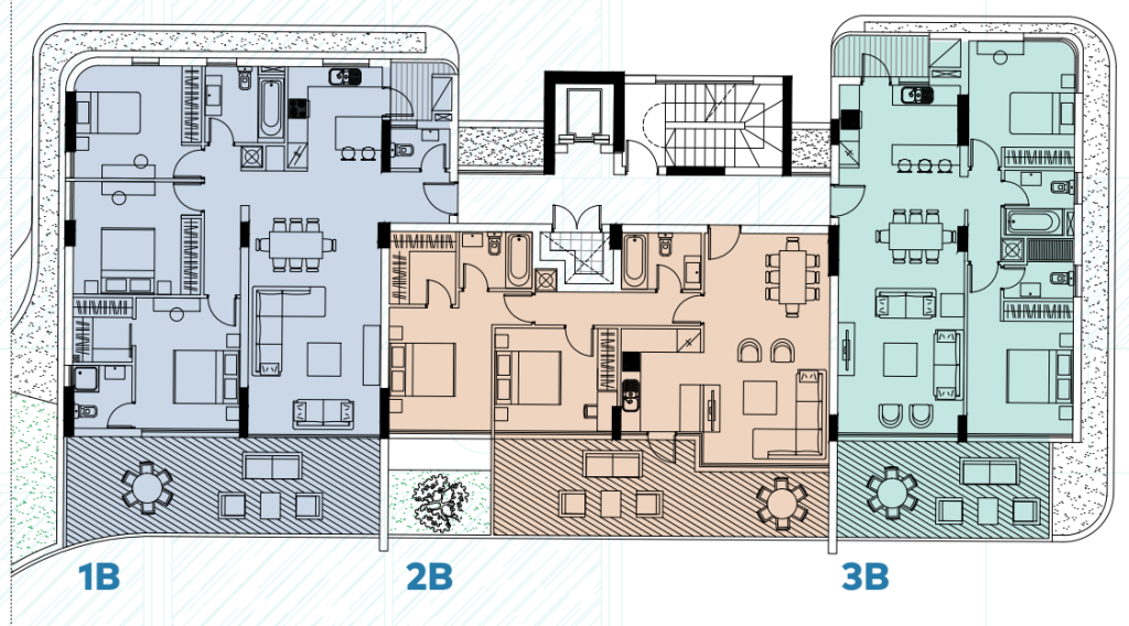 Strategically located at the northern end of the plot, this residential development optimally utilizes space with two buildings. Each building accommodates 12 apartments spread over the first four floors, consisting of 2 and 3-bedroom units, complemented by lavish 3-bedroom penthouses on the fifth floor, featuring roof gardens and swimming pools. Every apartment includes one parking space and a storage area, while additional parking is available for the penthouses.